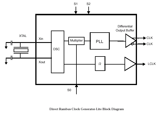 В состав блок-схемы DRCG-Lite входят: блок формированияисходящих синхроимпульсов (OSC Output Signal Clocks), умножитель (Multipler), блок ФАПЧ (PLL), делитель выходного OSC-синхросигнала (/2) и два дифференциальных выходных буфера (DOB).