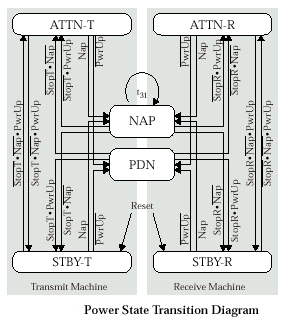 Каждый из блоков приема/передачи (мультиплексоры и демультиплексоры) должен постоянно "плавать" между состояниями STBY и ATTN, используя необходимый управляющий сигнал StopХХХ такого рода перемещения между этими двумя состояниями активности являются независимыми или зависимыми, и определяются сигналами StopT и StopR по утвержденному (уровень сигнала, достаточный для однозначного фиксирования перехода приемником, активный уровень) состоянию PwrUp и деактивированному Nap. Когда Nap/PwrUp не утвержден/утвержден, состояние NAP/PDN является выходным, а ATTN или STBY входящими в зависимости от значения сигналов управления StopT и StopR. Так, например, когда вход PwrUp деактивирован, основные функционирующие блоки входят в состояние PDN из которого могут немедленно выйти. Тоже самое происходит, когда состояние Nap является утвержденным, из которого блоки могут выйти лишь через время t31 (интервал действия NAP: 0.005-10 ms). Во время активности сигналов StopT и StopR действительный Nap позволяет минимизировать потребляемую мощность в состоянии «дремоты». Случай одновременной активации Nap и деактивации PwrUp является предшествующим состоянию PDN, которое утвердится в следующий момент.