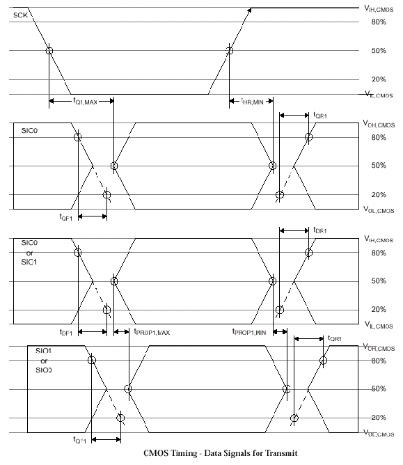 За счет внешнего опорного напряжения (VREF=1.4 В) стандартного CMOS-интерфейса, генерирующегося при помощи резистивного делителя, логические значения "0" и "1" представляются как 2.5 В (VOH,CMOS) и 1.7 В (VOL,CMOS) соответственно, т.е. разрядность составляет все те же 800 мВ, чтобы сохранить совместимость дискретизации уровней.