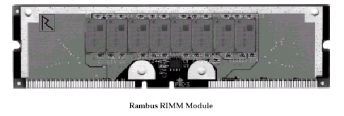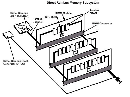Технология Direct Rambus DRAM, разработанная компанией Rambus, представляет собой высокоскоростную замкнутую систему функционирования, которая имеет свою адаптированную логику управления и точно рассчитанные параметры. DRDRAM позволяет достичь очень больших пиковых скоростей передачи данных: до 1.6 Гбайт/с на один канал и до 6.4 Гбайт/с при четырех каналах. Вся подсистема состоит из следующих компонентов: основной контроллер (RMC Rambus Memory Controller), канал (RC Rambus Channel), разъем для модулей (RRC - Rambus RIMM Connector), модуль памяти (RIMM Rambus In-line Memory Module), генератор дифференциальных синхроимпульсов (DRCG Direct Rambus Clock Generator) и сами микросхемы памяти (RDRAM Rambus DRAM). Физические, электрические и логические принципы и согласования, применяемые в системе, определены компанией Rambus и должны строго выполняться всеми производителями для соблюдения абсолютной совместимости ее частей, так она функционирует на очень большой частоте 600/711/800 МГц, синхронизируясь сигналом 300/350/400 MГц соответственно.