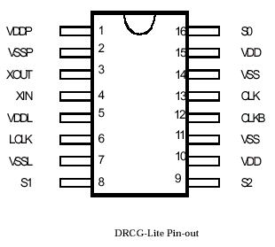 Специальная "усеченная" версия тактового генератора (DRCG-Lite), пакующегося в корпус типа 16pin 225mil TSSOP, рассчитана на применение в системах с "низкочастотным" входом: внешний интерфейс DRCG-Lite содержит опорный вход от внешнего кварцевого резонатора (сигнал XIN), где нижний порог значения входной частоты составляет 14.0625 МГц, а типичный 18.75 MГц. Также предусмотрен "низкочастотный" опорный выход (сигнал XOUT) для создания петли обратной связи в цепи внешнего резонатора, контролирующую девиации опорной частоты. Кроме этого имеется второй LVCMOS-выход (сигнал LCLK), реализованный по схеме частотного делителя, дающего половину опорной частоты и применяющийся для синхронизации остальных компонентов системы. Lite-генератор примененяется в "изолированных" системах с замкнутым циклом синхронизации (например, в видеоадаптерах), с использованием памяти, работающей в частотном диапазоне 300-400 MГц, и поддерживает коэффициенты умножения частоты 16x и 64/3x.
