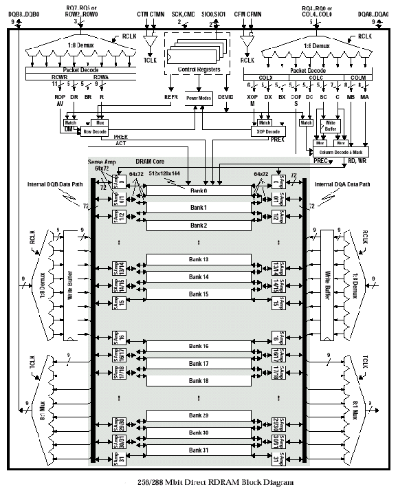 Стандартное ядро микросхемы CRDRAM содержит два (16/18 Мбит микросхемы) или четыре (64/72 Мбит приборы) независимых (Independent) логических банка (схема организации 2i или 4i), каждый из которых организован по 512 или 1024 строки (64/72х256х512 или 64/72х256х1024) соответственно. При этом, каждая строка, состоящая из 1 Кбайт или 2 Кбайт общего объема ядра, может быть активизирована в любое время (команда ACTV) и адресовать 1 Кбайт или 2 Кбайт страницу. В свою очередь, каждый банк связан со своим строчным кэшем (усилителем уровня, SenseAmp), который в 9-10 раз больше, чем у стандартных DRAM 64/72х256 Page. Столбцовая адресация (команды READ и WRITE) может активизировать адресуемую страницу, поскольку эти операции выполняются страничным декодером (усилителем) для каждого банка отдельным.