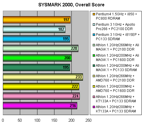 Переход на 266 шину и/или DDR память влечет за собой примерно одинаковый прирост производительности для наборов офисных приложений, причем характерно, что прирост для системы на базе чипсета Ali Magik 1 намного более сильный, нежели для систем на базе AMD-760 или KT-133A. Придется еще поработать над драйверами и BIOS. Хорошо, если не над контроллером памяти и системной шины…