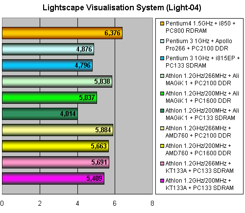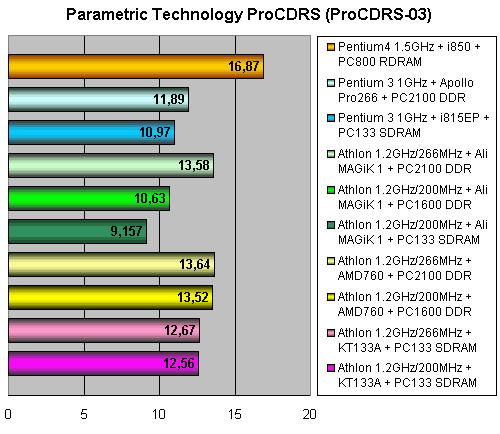 Для профессионального применения в системах 3D моделирования Pentium 4 подходит как нельзя лучше, более того, по мере оптимизации под SSE2 и увеличении тактовых частот он проявит себя еще лучше. Но работяга Athlon старается не отставать и практически наступает на пятки своему конкуренту. При этом прирост от использования DDR памяти и 266МГц шины весьма незначителен, основываясь на результатах чипсетов от AMD и VIA, зато волшебный Magik 1 демонстрирует обратное. Кстати, это практически единственный тест, где проявляется превосходство DDR памяти над SDR для процессора Pentium III. Надеемся, что по мере оптимизации драйверов и BIOS чипсет Apollo Pro266 все же проявит себя с лучшей стороны и окажется востребованным не только за свою широчайшую функциональность, но и за достойную производительность — хотя бы процентов на пять больше, чем у i815EP.