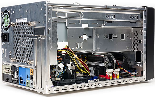 После откручивания трех винтов внешний П-образный кожух снимается как с большинства корпусов башенного типа, после чего можно забраться внутрь компьютера. Впрочем, сразу мы слишком много не увидим, поскольку этому будут мешать корзина для накопителей и разнообразные провода. Разве что оценить внушительный размер радиатора фирменного кулера можно.