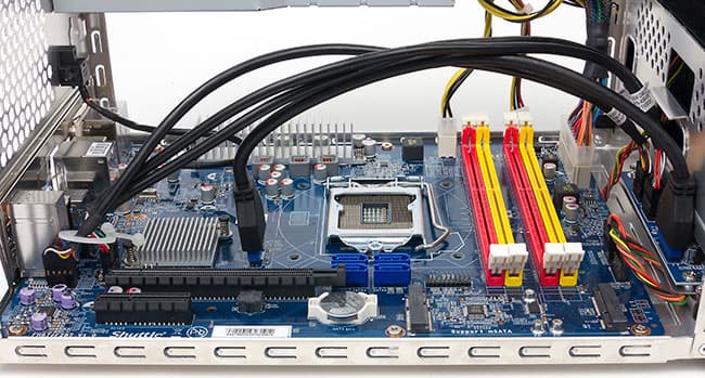 Четыре стандартных слота для памяти типа DDR3 — тоже особенность «стандартных» компьютерных плат (и то не всех), так что и с этой точки зрения покупатель не будет ничем ограничен на практике. Единственное замечание — желательно не гоняться за «оверклокерской» памятью с вычурными радиаторами (тем более что разгон памяти чипсетом все равно не поддерживается), а ограничиться модулями нормальной высоты. В противном случае дисковая корзина при установке упирается в радиаторы памяти через кабели, идущие к передней панели, с чем мы и столкнулись, используя набор Corsair Dominator Platinum CMD16GX3M4A2666C1 на 16 ГБ. Впрочем, все поместилось и ничего не сломалось, однако на всякий случай для постоянного использования лучше такого избегать.