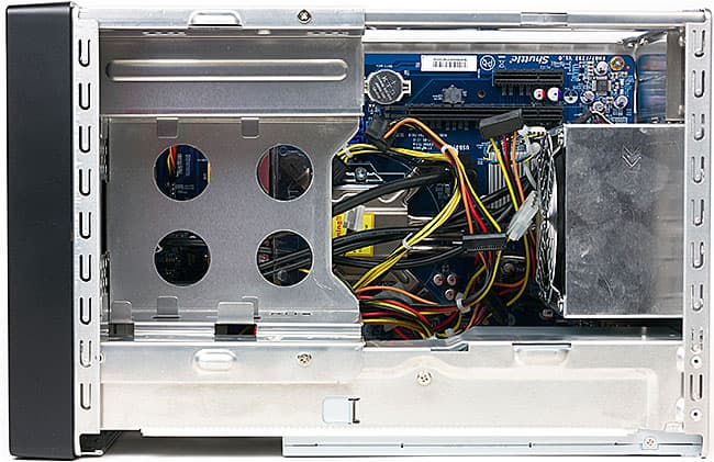 Перфорированы и обе боковые стенки — чтобы было откуда воздух забирать. К сожалению, никаких пылевых фильтров не предусмотрено, так что в процессе эксплуатации систему (впрочем, как и большинство других компьютеров, независимо от форм-фактора) желательно изредка чистить от пыли.