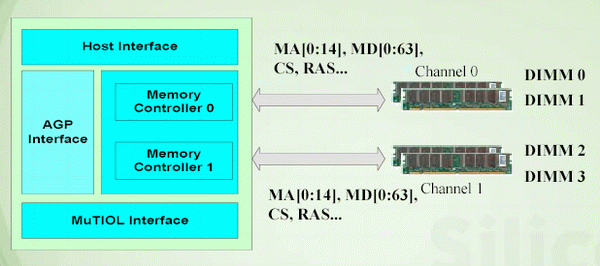 А вот режим «2x64», раз уж мы решили все понимать буквально, должен обеспечивать именно ту функциональность, которую отобразила на своих рисунках SiS. То есть на самом деле контроллер в каждом конкретном применении является по сути одноканальным, но прирост скорости должен достигаться за счет того, что их два и работать они могут параллельно. SiS655 в этом смысле ничем не отличается от давно уже присутствующих на рынке NVIDIA nForce/2 и недавнего Intel E7205. Такой двухканальный режим более всего (из уже известного) напоминает приснопамятный Bank Interleave от VIA, с той только разницей, что при внутрикристальной конвейеризации VIA используется чередование логических банков внутри микросхемы, а в нашем случае чередование внешних физических строк.