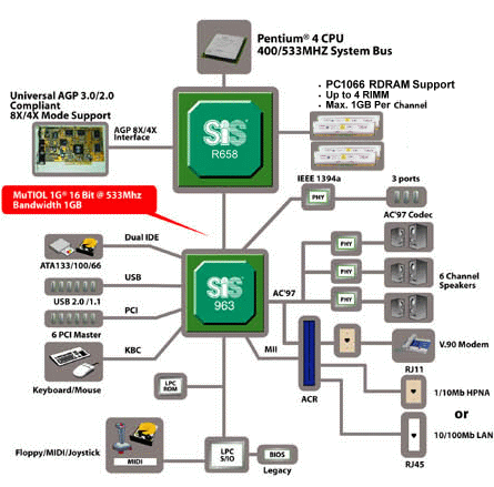 Если отбросить «маркетинговые заморочки», которые, естественно, даже лапки-захваты на коннекторах IDE представляют нам как «Великое Достижение Прогресса» и «Патентованную Технологию Нашей Самой Лучшей Компании», то можно заметить, что чипсет SiS R658 представляет собой давно нам знакомый южный мост SiS963 (USB 2.0 + FireWire, остальное «по прейскуранту») в комбинации с северным мостом SiS R658. Северный мост же этот обеспечивает характерную для всех современных чипсетов функциональность, но к тому же нагло попирает святыни (в лице Intel 850E), поддерживая не только новаторскую PC4200 RDRAM, но и «еще более новаторскую» PC4800 RDRAM. Прочее: AGP 8x, ATA133, шестиканальный AC'97 2.2, интегрированный 10/100 Ethernet MAC