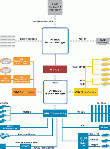 Описание этого чипсета займет поменьше места, ибо никакими интригующими новшествами он не обладает, являясь стандартным продолжением в линейке чипсетов VIA под Pentium 4. Ну, разве что в целях унификации (с серией «KT» под Athlon XP) эта линейка из «P4X» переименована в «PT», да имеет совершенно непонятно откуда взявшееся окончание «800» (вероятно, для красоты). В целом же для знакомства с предшественником рассматриваемого ныне чипсета вы можете прочитать наш обзор P4X400 (напомним, что платы на обновленном степпинге того чипсета все же заработали с DDR400, хотя и совершенно не ускорились от этого).