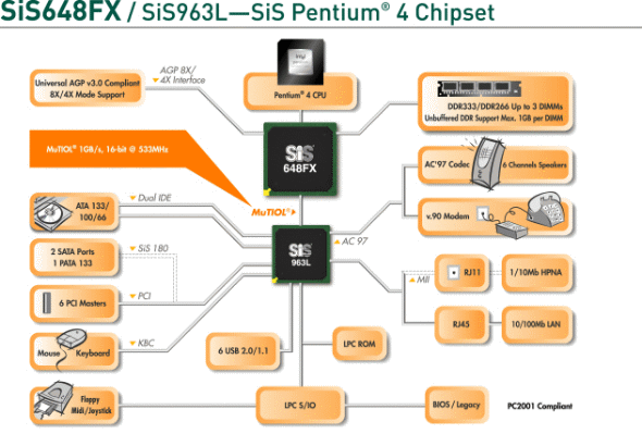 Взятая с сайта SiS картинка неадекватна ситуации :). Во-первых, у SiS648FX поддержка DDR400 абсолютно официальна (в отличие как раз от его предшественника), а во-вторых, единственная реально новая возможность поддержка 800-мегагерцовой процессорной шины на этой диаграмме вообще не отражена. Собственно, только полутора упомянутыми деталями различия между чипсетами и ограничиваются. Можно также заметить, что «официальной парой» нового продукта является южный мост SiS963L, тогда как SiS648 в свое время изображался в паре с полной версией этого моста SiS963 (включающей контроллер FireWire, а потому более дорогой). Данная ситуация как нельзя лучше иллюстрирует произошедшую перемену: SiS648 в момент анонса претендовал на лидерство по скорости и функциональности, SiS648FX выпущен для борьбы в нижнем ценовом сегменте. Ну и традиционно напомним, что по разводке и интерфейсу соединения с северным мостом все последние южные мосты компании взаимозаменяемы, так что при желании никто не мешает использовать на материнской плате любой из них.