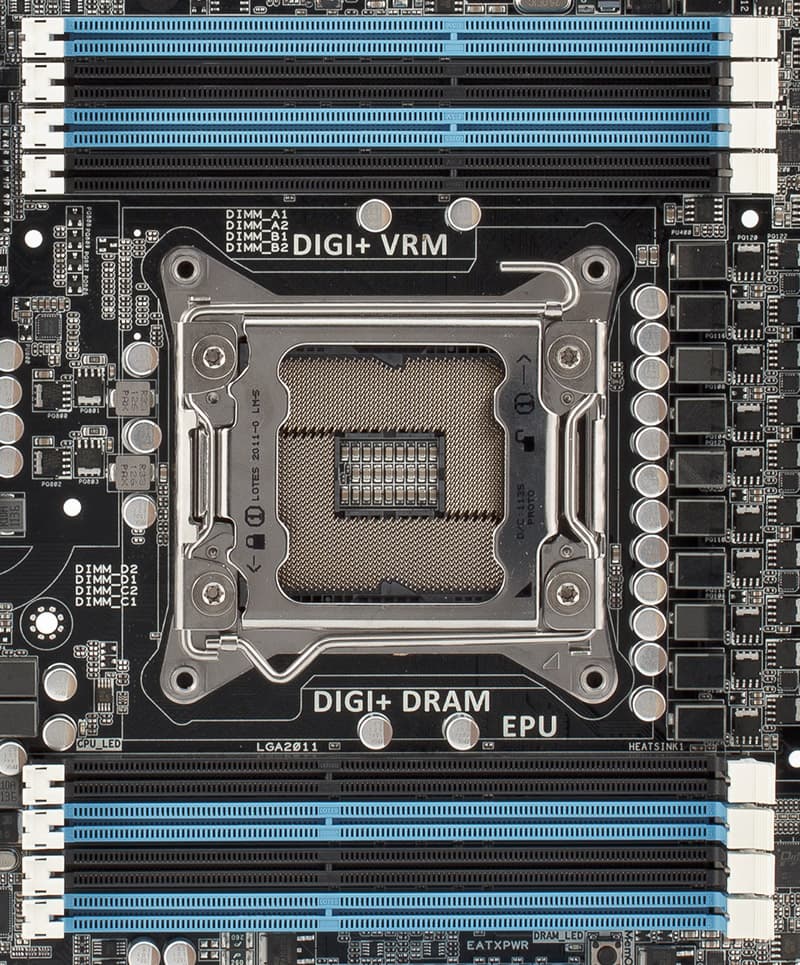 Дизайн нынешних моделей под Socket 2011 заметно отличается от типового дизайна прежних моделей среднего сегмента. Более того, и на платы прежней топовой платформы Socket 1366 они не очень похожи. Начнем с неизбежно главного параметра — определяющего название платформы.