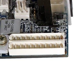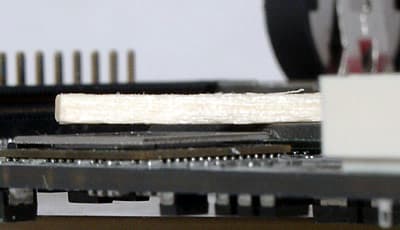 На приведенной фотографии хорошо видно, каков зазор между лежащей на чипе северного моста спичкой и поверхностью процессорной крышки. Миниатюризация здесь явно не на пользу низкопрофильному процессору, в то время как объединенные под общий радиатор кристаллы чипсета имеют одинаковую высоту и, соответственно, не имеют проблем. Разве что совершенно непонятно, зачем нужен радиатор для VT8237, в то время как платы абсолютного большинства производителей прекрасно без него обходятся. Возможно, это чисто технологическое решение, обусловленное нехваткой места для иного расположения и размеров устройства охлаждения.