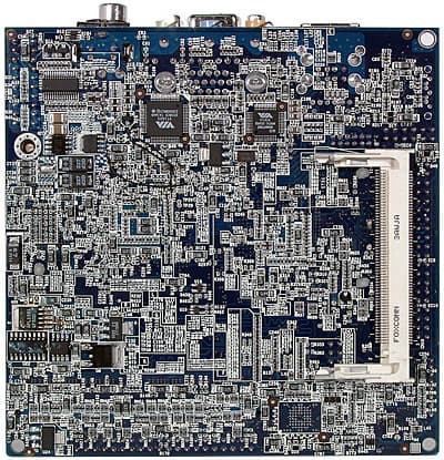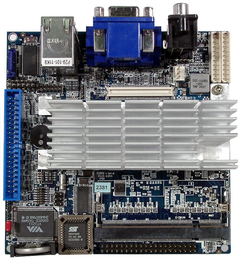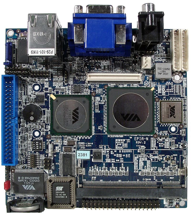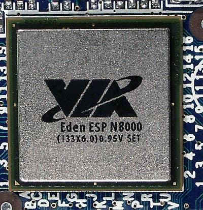 Первым номером, разумеется, идет сверхминиатюрный процессор VIA Eden ESP N (в нашем случае с частотой 800 МГц при частоте FSB 133 МГц, а в будущих моделях форм-фактора nano-ITX возможно применение Eden ESP N 1 ГГц и более новых процессоров, уже с FSB 200 МГц). По сути, это знакомое нам ядро Nehemiah в уникальной корпусировке nanoBGA с 324 контактами (сравните с 370 у уже существующих Eden ESP), но очень маленькой подложкой (размер всего 15x15 мм такое можно себе позволить, если процессор будет устанавливаться не в универсальный сокет, а прямо на плату и один-единственный раз). Очень кратко напомним, что отличительными особенностями ядра Nehemiah являются 64-килобайтные кэши первого уровня (данных и команд) и объединенный кэш второго уровня, полноскоростной блок FPU и поддержка набора команд SSE. В результате C3 Nehemiah уже может серьезно сравниваться если и не с Pentium III, то хотя бы с равночастотным Celeron «Coppermine». К восьмой ревизии (степпингу) ядра Nehemiah удалось уменьшить его размер (с 52 до 47 мм2), понизить напряжение питания (с 1,4 В до 0,81,05 В в зависимости от частоты модели) и добавить APIC именно эта версия и легла в основу процессора Eden-N (будем для краткости называть его так).
