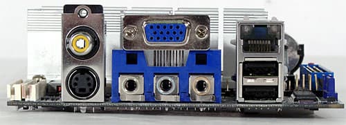 Места для выведенных на заднюю панель платы разъемов очень мало, так что приходится жертвовать чем-то из стандартных (в данном случае, как минимум, отсутствуют порты PS/2, параллельный и последовательные порты). Зато в добавление к аналоговому выводу на монитор (D-Sub) есть S-Video и коаксиальный выход (может использоваться для вывода видео или в качестве S/PDIF-Out, режим работы задается перемычкой на плате). 3 аналоговых звуковых разъема позволяют, в том числе, выводить 6-канальный звук (функциональность настраивается в драйверах). Сетевая розетка и всего 2 порта USB завершают картину. Отметим общую компактность платы ее габаритная высота не превышает 3,5 см от поверхности PCB.