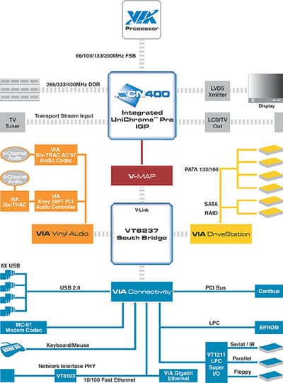 В качестве набора системной логики для EPIA-N используется VIA СN400 с интегрированным графическим AGP-ядром UniChrome Pro и южным мостом VT8237. Северный мост чипсета рассчитан на процессорную шину AGTL(+) (Socket 370) и работу с DDR-памятью (до 1 ГБ DDR200/266/333/400). Как мы уже видели в тестировании EPIA-5000, потребность в памяти с высокой пропускной способностью DDR существует даже при частоте FSB 133 МГц (пропускная способность которой 1 ГБ/с), если предполагается работа встроенного видеоускорителя. Упомянутое ограничение на объем памяти диктуется разводкой на плате только одного разъема SODIMM. Кстати, модули этого типа стоят лишь немного дороже обычных DIMM, так что по цене здесь большой переплаты не будет. Отметим, что CN400 поддерживает частоту FSB 200 МГц, на которой вскоре ожидается выход новых процессоров линейки C3/Eden ESP.