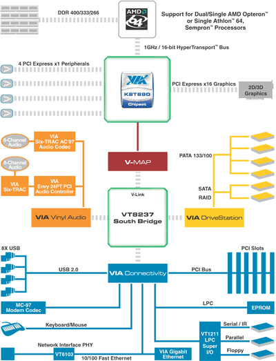 На блок-схеме нового чипсета хорошо видно его отличие от предшественников: приход PCI Express выражается в наличии графического интерфейса PCIEx16 вместо AGP. Запланированные на ближайшее будущее северные мосты VIA поддерживают суммарно 20 линий PCI Express, и в данном (K8T890) случае остающиеся 4 линии предназначены для подключения слотов PCIEx1 для периферии. Не анонсированные пока дальнейшие продукты VIA будут позволять использовать эти четыре линии под второй графический слот, для создания систем с парой видеоадаптеров (по типу NVIDIA SLI или просто для мультимониторных решений). В случае же K8T890 нет другой возможности организовать поддержку PCIE-периферии, так как старый южный мост не имеет контроллера этой шины, да и видеокарты NVIDIA все равно бы не заработали в режиме SLI в материнской плате на базе этого чипсета (текущие видеодрайверы калифорнийской компании этого не позволяют).