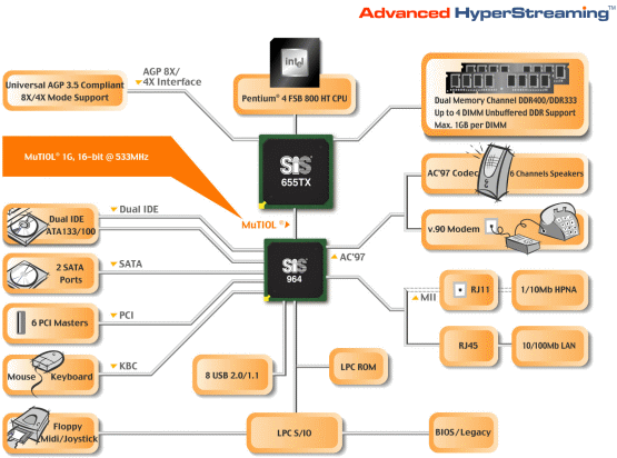 SiS655TX венчает нынешнюю линейку чипсетов SiS под Pentium 4, обладая и наивысшей функциональностью (впрочем, по этому параметру он от SiS655FX не отличается), и [предположительно] наивысшей производительностью. Давайте сразу взглянем на функциональную блок-схему новичка:
