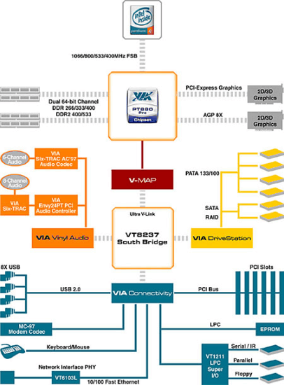 С южным мостом все просто это по-прежнему VIA VT8237 (называемый теперь из-за проблем с зарегистрированными торговыми именами VT8237R). Уже пару лет мы ждем смену этому ветерану, но VT8251 пока все еще обещается во втором квартале этого года. Так что теоретически можно будет увидеть PT880 Pro и в паре с VT8251, но, учитывая, что этот чипсет нацелен на нижний сегмент рынка, вероятность не слишком велика. Впрочем, на фоне конкурентов VT8237 все еще выглядит прилично, хотя ни периферию PCI Express (где бы ее найти?), ни гигабитную сеть (а вот это в отсутствие портов PCI-E «не лечится»), ни звук HDA не поддерживает.