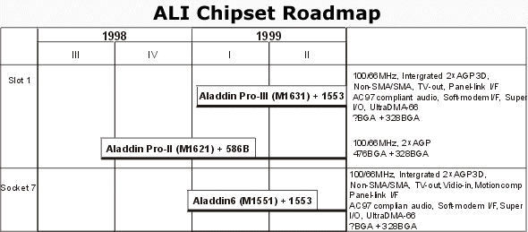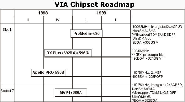 - Первое, что хочется отметить, это то, что развитие SuperSocket 7 в 1999 году будет успешно завершено. Выходящие в начале года VIA MVP4 и ALI Aladdin 6 — последние чипсеты для этого гнезда. Однако на начало года они будут представлять собой достаточно перспективные вещи и содержать поддержку UltraDMA-66, а также интегрированные 3D-акселераторы начального уровня, поддерживающие архитектуру разделяемой памяти.