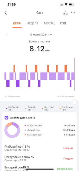 Взаимодействие со смартфоном осуществляется через приложение «Honor Здоровье», предоставляющее традиционный для подобных устройств список возможностей – от разнообразных настроек до представленной в максимально наглядной форме статистики. Еще раз отметим, что количество кислорода в крови (SpO2) и пульс могут отслеживаться постоянно и в автоматическом режиме, но ради экономии заряда аккумулятора эту опцию можно и отключить.
