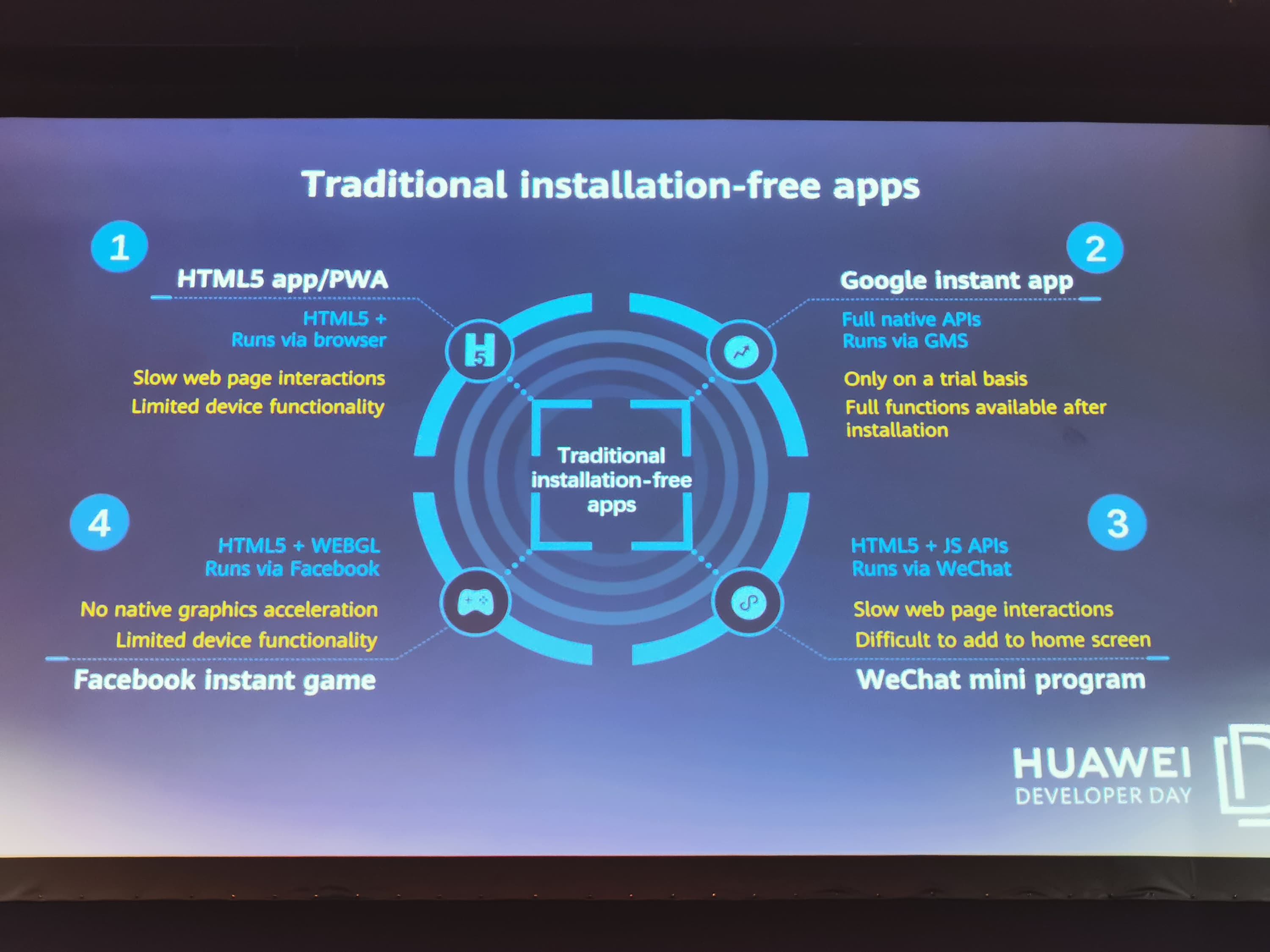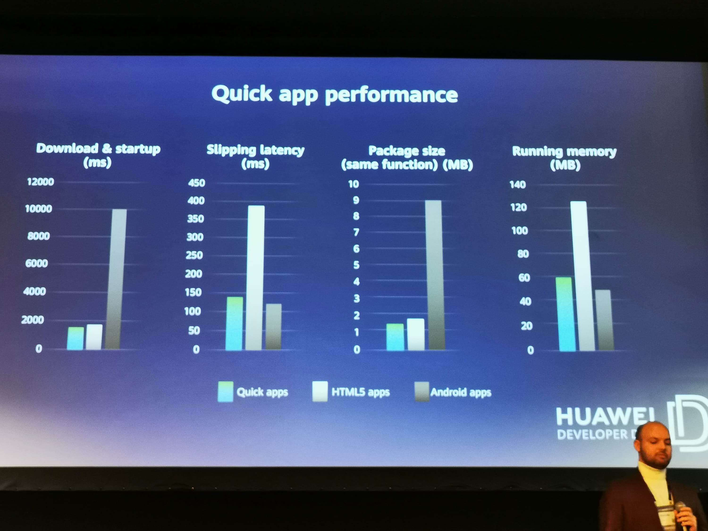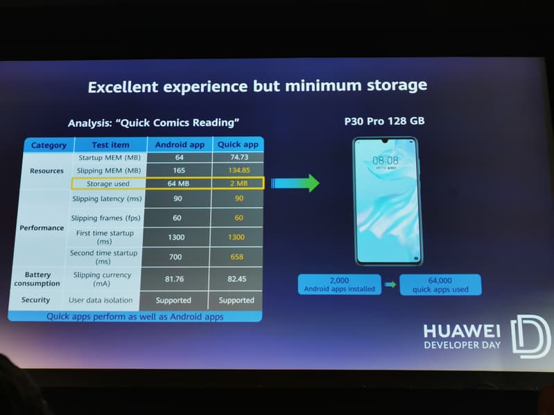 Установка приложений Quick App подразумевается не только из магазина, но и с помощью системы поиска, рекомендаций и Huawei Assistant. Вопроса безопасности подобных решений Roland Bartella в докладе не касался. Менеджер по продуктам европейского отделения мобильных сервисов лишь отмечал преимущество Quick App с точки зрения скорости загрузки, экономии свободного пространства на диске и количества запущенных приложений за прошедший период. В графе Security при этом было отмечено просто «Supported».