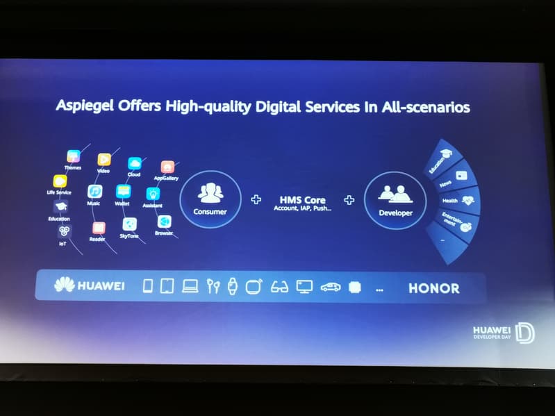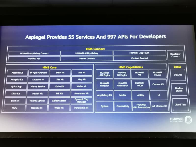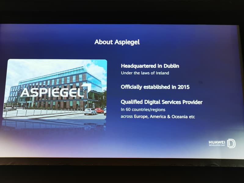 Стоит отметить, что технически компания была создана в ирландской юрисдикции еще в 2015 году со штаб-квартирой в Дублине. Это говорит о том, что в Huawei уже тогда понимали потенциальную уязвимость компании целиком и полностью китайского происхождения. Джервис Су (Jervis Su), генеральный директор Aspiegel Ltd, выступая на конференции Developer Day в рамках Web Summit 2019 в Лиссабоне, отметил, что ядром будущей экосистемы Huawei станет платформа HMS (Huawei Mobile Services), в которую входят такие сервисы, как AppGallery, Mobile Cloud, Themes, Video, Browser, Assistant и ряд других.