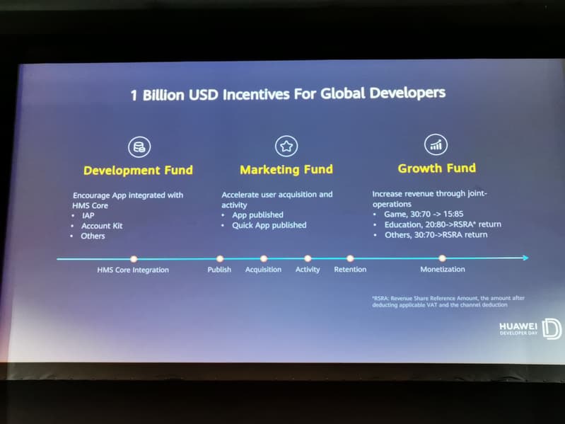 На Web Summit 2019 Джервис Су подтвердил намерение Huawei инвестировать 1 млрд долларов в программу поддержки сторонних разработчиков Developer Incentive Program. Деньги должны пойти на разработку приложений и сервисов для HarmonyOS, а также на создание собственной мобильной экосистемы. Кроме этого, другие представители компании рассказали об усовершенствованиях набора инструментов для разработчиков (IDE), новых функциях фирменного магазина приложений, а также анонсировали запуск нескольких сервисов.