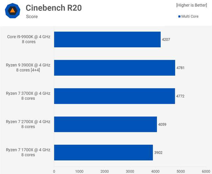 Как видно, AMD Ryzen 9 3900X превосходит 16-ядерную модель AMD Ryzen Threadripper 2950X, модель AMD Ryzen 7 3700X по производительности соответствует моделям Intel Core i9-9900K и AMD Ryzen Threadripper 2920X, а процессор AMD Ryzen 5 3600X соответствует 10-ядерному Intel Core i7-6950X. Наконец, AMD Ryzen 5 3600 превосходит Intel Core i7-9700K, хотя стоит почти в два раза меньше.
