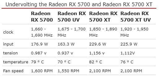 Проведенное им исследование показало, что снижение напряжения ядра Radeon RX 5700 с 0,987 до 0,937 В приводит к повышению частоты GPU на 10-15 МГц, снижению энергопотребления на 7,5% и температуры на 9 °C. В случае модели Radeon RX 5700 XT при снижении напряжения на 0,044 В частота повысилась на 60-70 МГц, энергопотребление почти не изменилось, а температура снизилась на 6 °C. Судя по тестам, прирост производительности пропорционален приросту частоты. Источник отмечает, что скорости вращения вентиляторов остались прежними, то есть и уровень шума тоже.