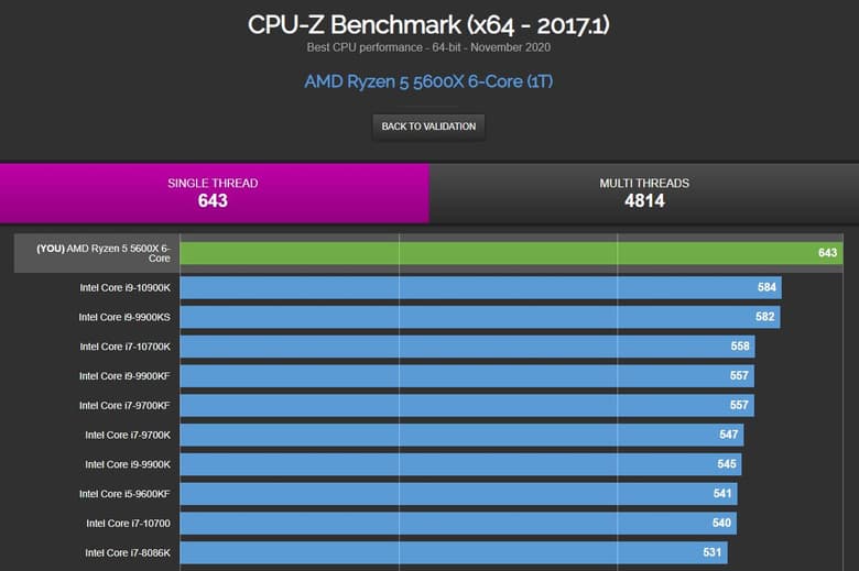 Если верить скриншоту, в однопоточном тесте 6-ядерный процессор AMD Ryzen 5 5600X набрал 643 балла, на 10% опередив процессор Intel Core i9-10900K, на 15% — Intel Core i7-10700K и на 23,4% — AMD Ryzen 9 3900X. Таким образом, AMD покончила с лидерством Intel в однопоточной производительности.