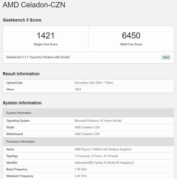 А завершает этот раздел публикация, в которой предрекается, что APU AMD Ryzen 5000 уничтожат процессоры Intel Tiger Lake. Основанием для прогноза стал первый тест будущей флагманской модели AMD Ryzen 7 5800U, появившийся в сети. В тесте Geekbench 5 этот APU набрал 1421 балл в однопоточном режиме и 6450 баллов — в многопоточном. То есть по сравнению с Ryzen 7 4800U он на 38% быстрее в однопоточном тесте и на 10% — в многопоточном. При этом частота увеличилась незначительно — с 1,8/4,2 ГГц до 1,9/4,44 ГГц. Конфигурация APU в обоих случаях включает восьмиядерный CPU.