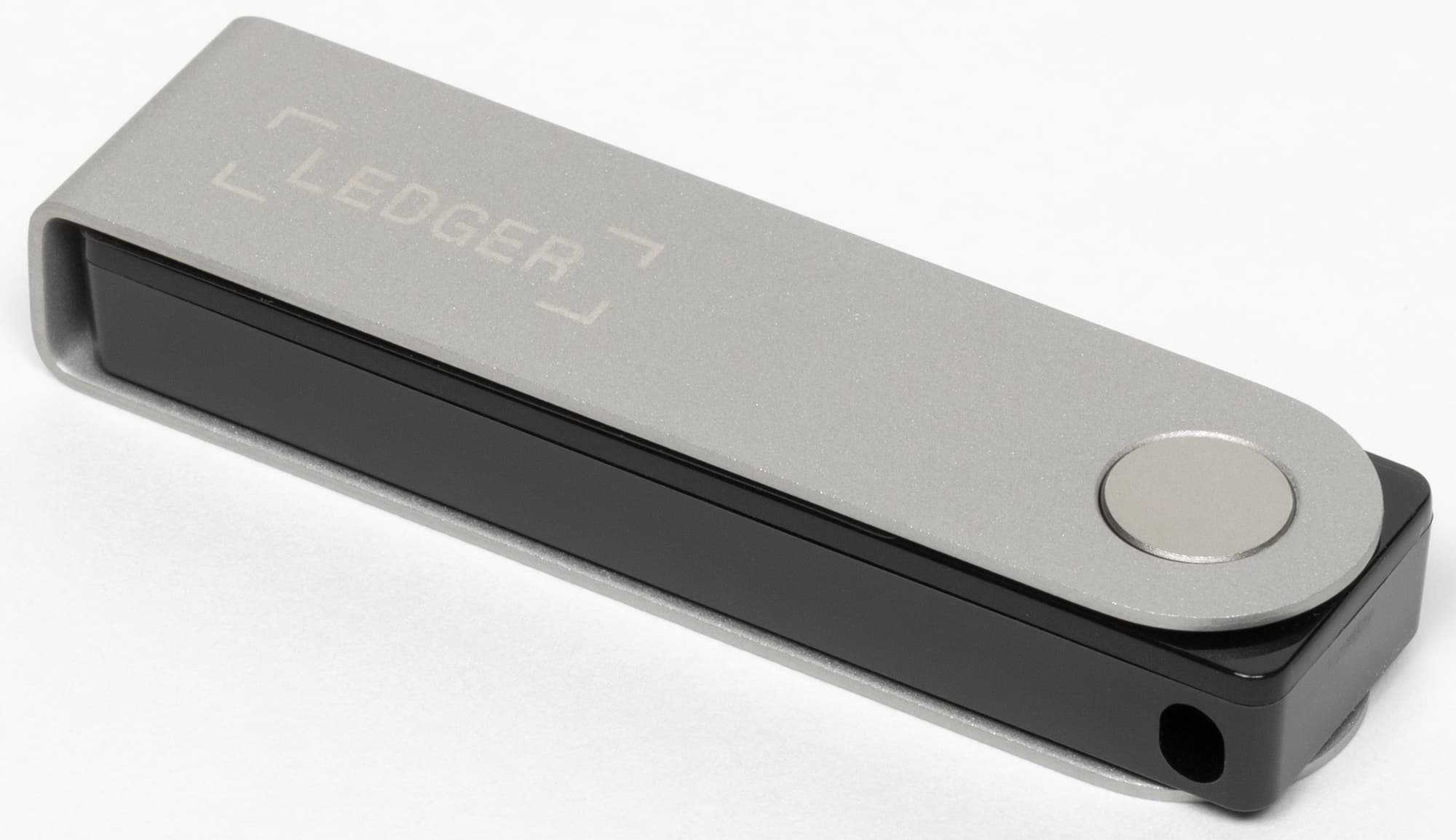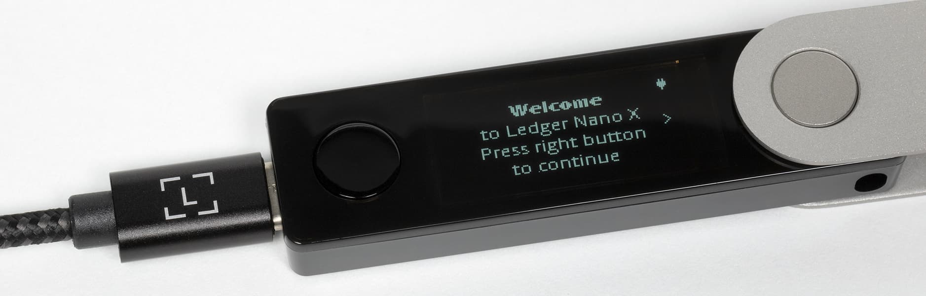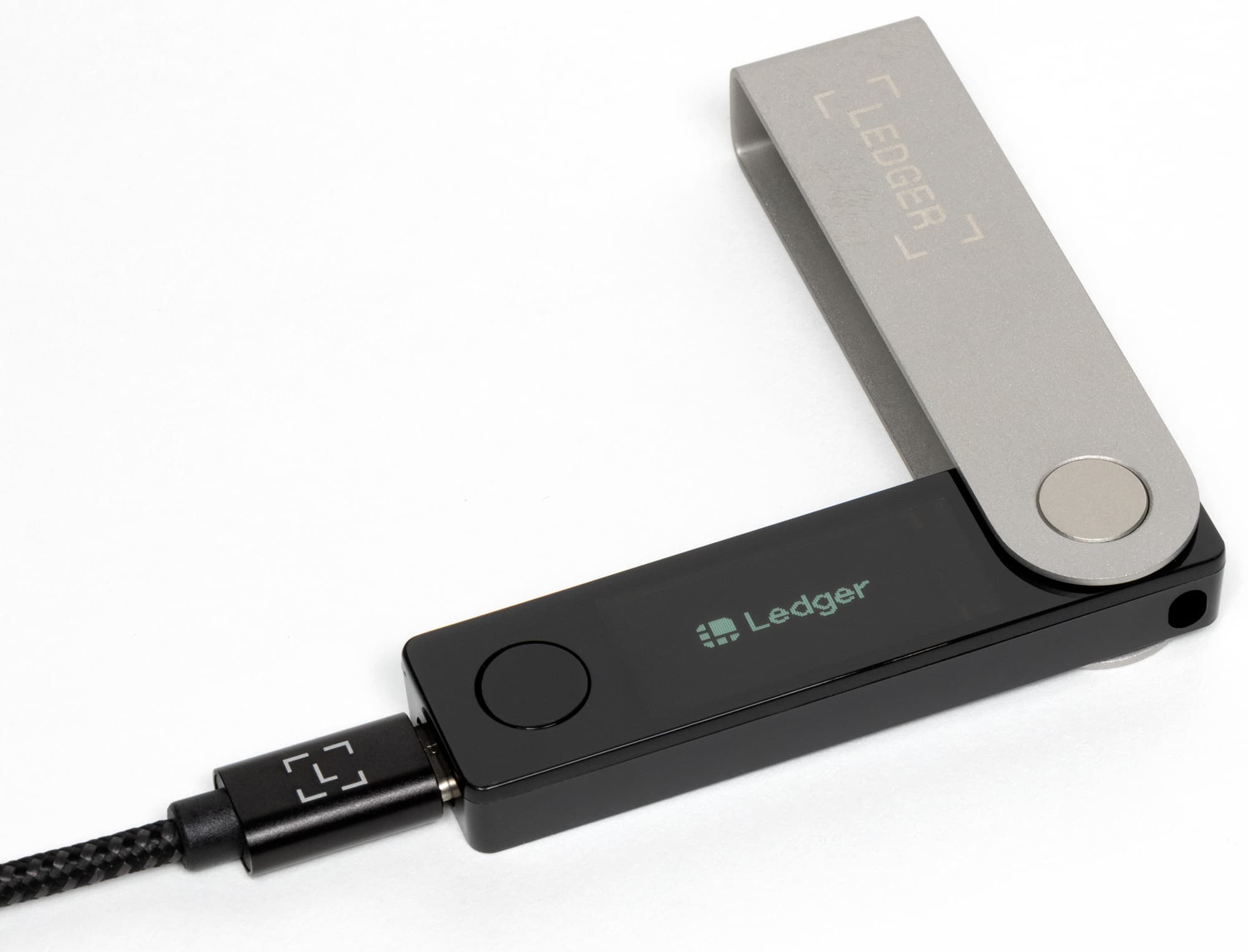 Выглядит Ledger Nano X как необычная премиальная флешка. Снаружи откидывающаяся крышка из нержавеющей стали и нанесенным логотипом компании, под ней пластиковый корпус с монохромным OLED-экраном и двумя кнопками. На торце есть разъем USB-C для зарядки и подключения к компьютеру. Смотря на Ledger Nano X и не скажешь, что в нем могут храниться большие активы, однако внешность обманчива.