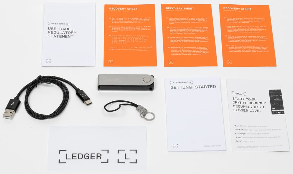 Герой нашего обзора, Ledger Nano X поставляется в белой коробке, внутри которой есть несколько важных вещей, помимо самого кошелька. Во-первых, конечно же, это веревочка, куда без нее в современном мире. Во-вторых, это несколько листов для записывания seed-фразы. Дело в том, что при первичной активации кошелька он выдаст фразу из 24 уникальных слов, которые нужно сохранить в безопасном месте. Даже если вы потеряете или у вас украдут само устройство, вы сможете купить новое (или воспользоваться одним из поддерживаемых горячих кошельков-приложений) и восстановить с этой фразой доступ к активам. В коробке также лежит кабель USB-C для зарядки и подключения к ПК или ноутбуку, чтобы работать с приложением Ledger Live.