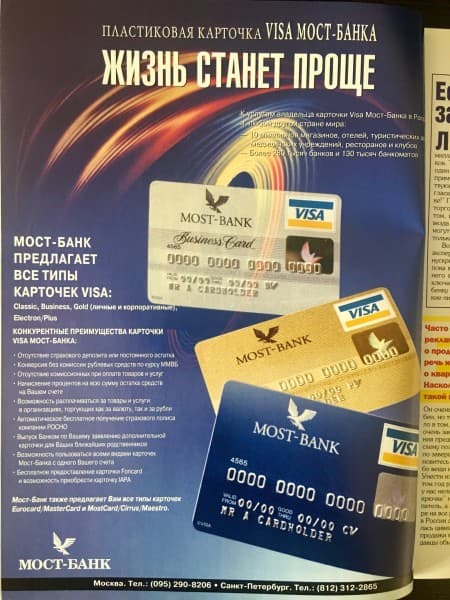 Еще одним амбициозным игроком рынка (ну... того, что тогда считалось рынком) был еще более легендарный «Мост-банк». В принципе, он был и одним из первых банков, выпускавших в России карты Eurocard (тогда еще независимой системы, но уже потихоньку сливающейся с американскими партнерами в Mastercard) и Visa еще в 1992 году. Казалось бы, зачем придумывать что-то локальное? Ответ простой: цена.
