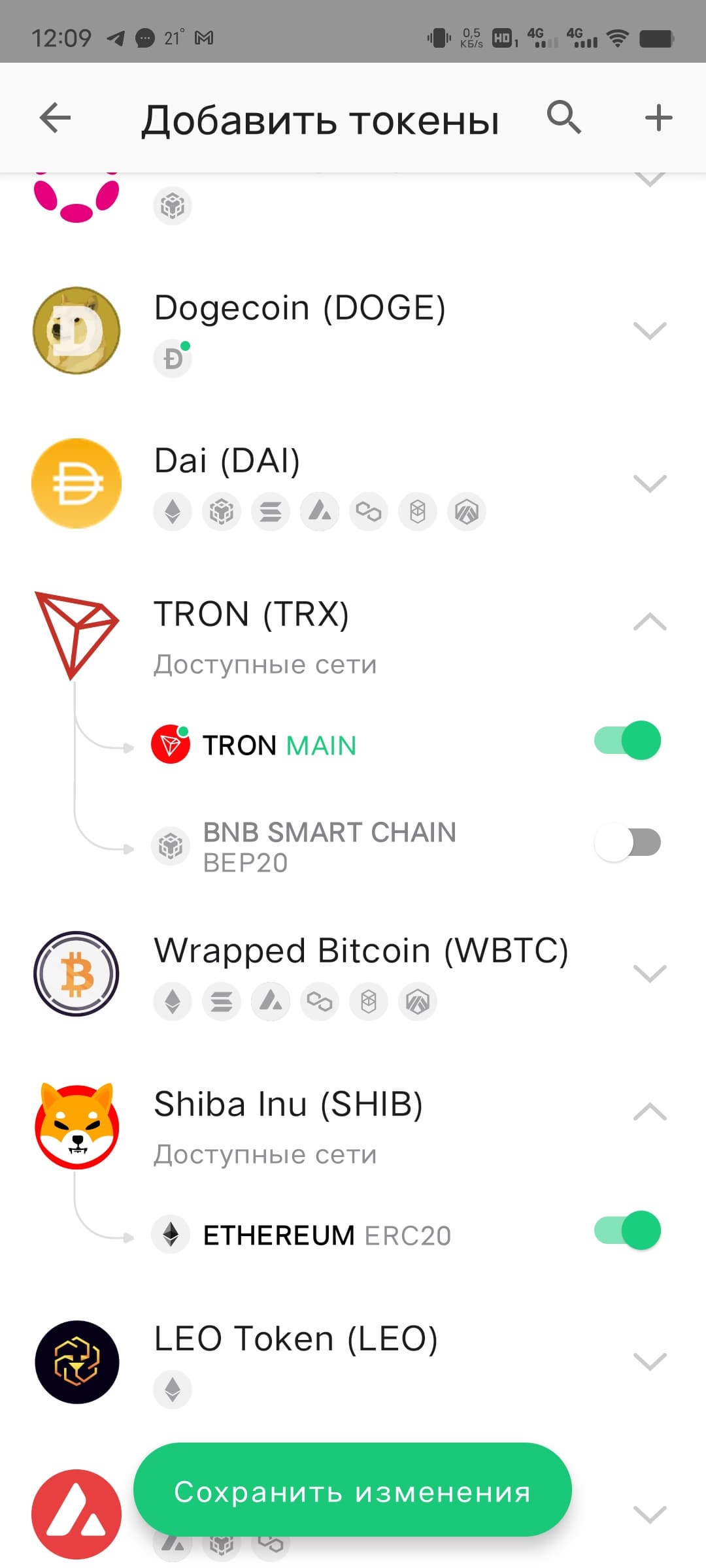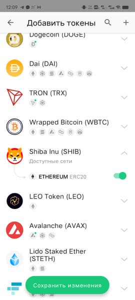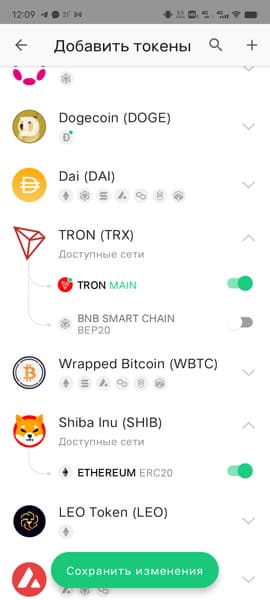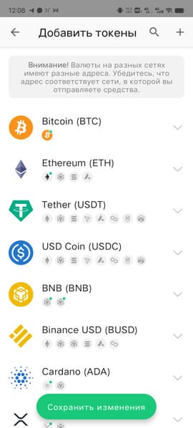 Изначально на главном экране видно только монеты Bitcoin и Ethereum. Остальные валюты с соответствующим блокчейнами необходимо подключать вручную.