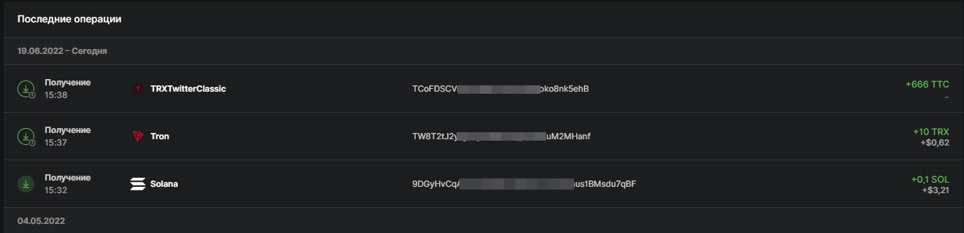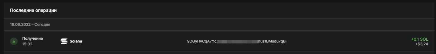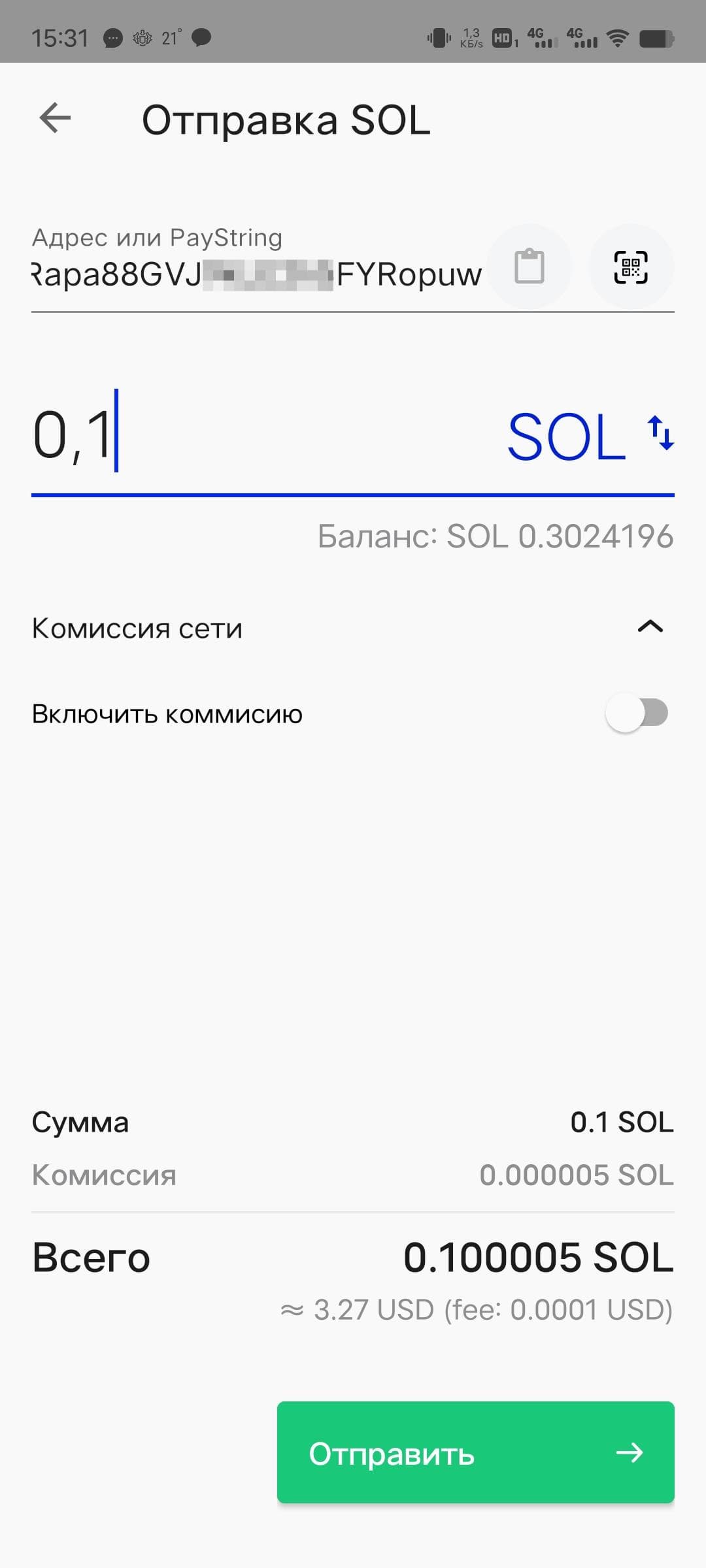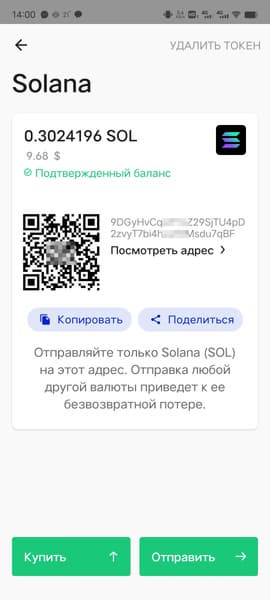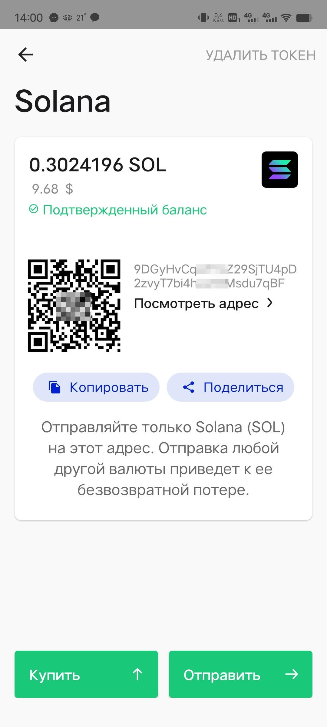 В целом же, операции по переводу криптоактивов как на кошелек, так и с него реализованы достаточно просто и понятно. Открываете меню с нужной криптовалютой и выбираете требуемое действие — копирование публичного адреса кошелька для зачисления или жмете кнопку «Отправить» для перевода.