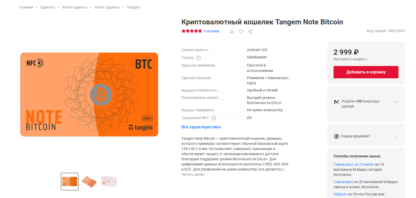 Можно упомянуть, что помимо Tangem Wallet существует Tangem Note. Это очень простой в использовании одновалютный кошелек, с помощью которого также можно покупать, хранить, продавать и пересылать криптовалюту.