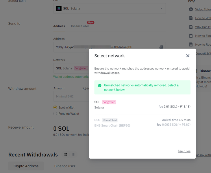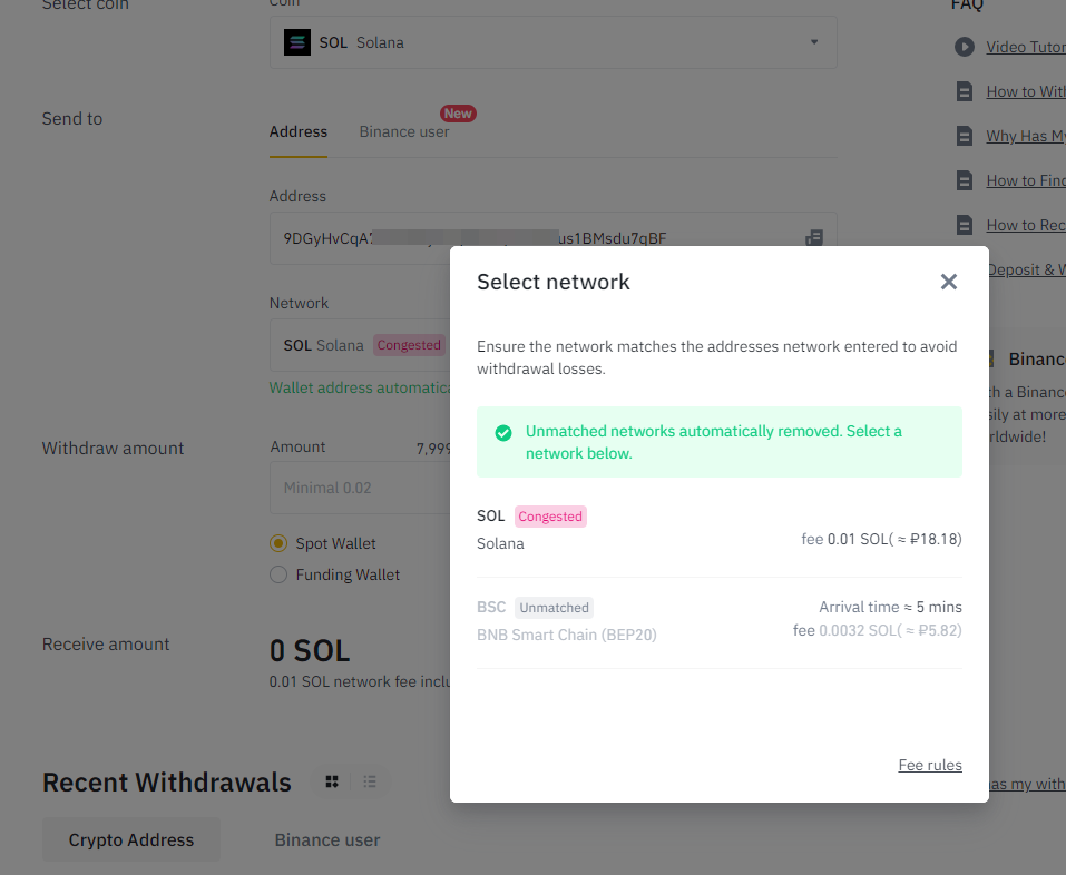 Мы протестировали переводы с горячего кошелька биржи Binance на наш Tangem в сетях BNB Smart Chain (BEP20), Shiba Inu на блокчейне Ethereum, SOL в сети Solana и, разумеется, Bitcoin.