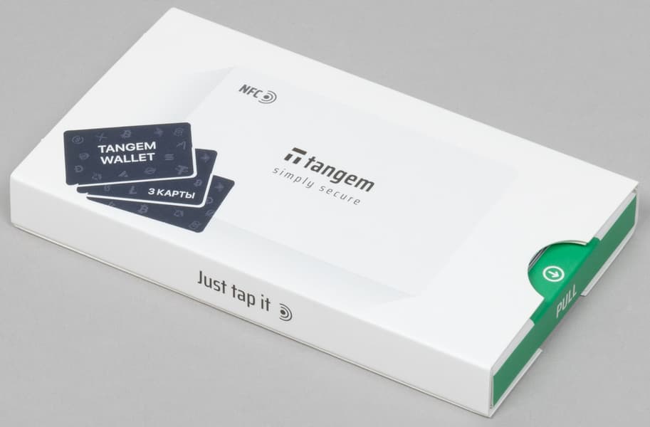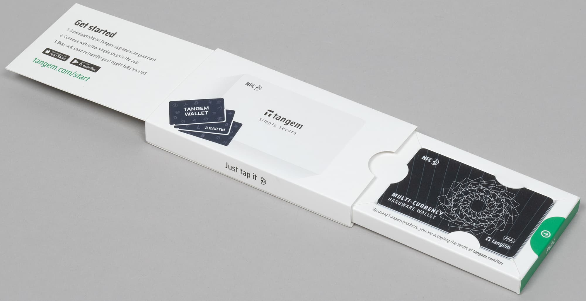 Упаковка Tangem представляет собой небольшую коробочку, которая эффектно раздвигается, открывая нишу с теми самыми тремя картами и короткой инструкцией.