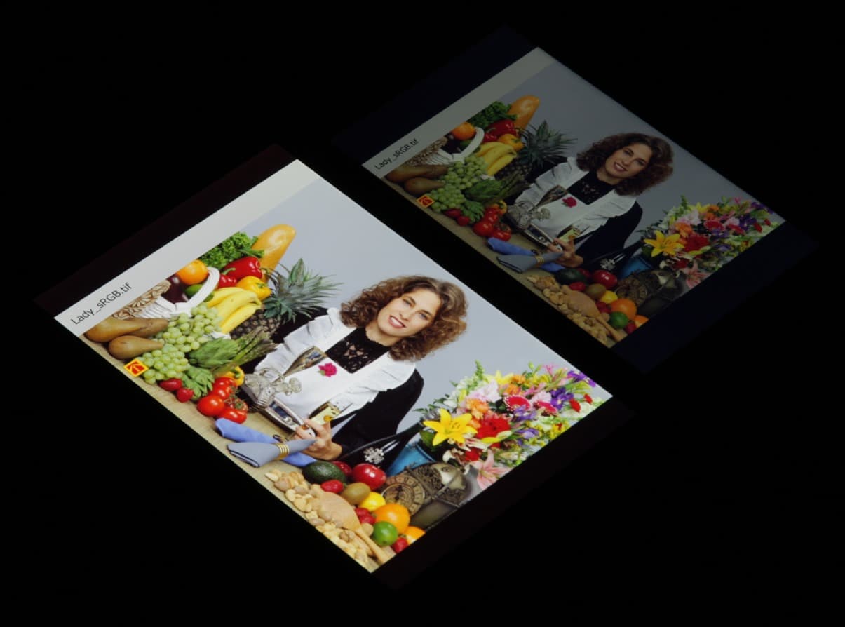 Экран имеет хорошие углы обзора без значительного сдвига цветов даже при больших отклонениях взгляда от перпендикуляра к экрану и без инвертирования оттенков. Для сравнения приведем фотографии, на которых на экраны Alcatel Pop 4 (6) и Nexus 7 выведены одинаковые изображения, при этом яркость экранов изначально установлена примерно на 200 кд/м², а цветовой баланс на фотоаппарате принудительно переключен на 6500 К.