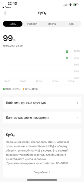 В идеале при нескольких последовательных измерениях SpO2 должен быть примерно одинаковый результат в диапазоне 95%—98%. Но, честно признаемся, практически ни одна из протестированных нами ранее моделей не справлялась с этой задачей. Так что, будем надеяться, к третьей волне пандемии разработчики все-таки допилят алгоритмы.