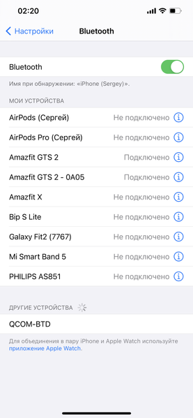 Как оказалось, решение проблемы было очень неординарным. Надо было открыть на iPhone «Настройки» / Bluetooth и, оставив этот экран открытым, найти в меню часов «Настройки» / «Сеть и соединения». Там появится iPhone, дальше надо выполнить подключение оттуда. И вот тогда уже в приложении Zepp удастся активировать телефонные разговоры через часы. Получается удивительная картина, которой мы никогда раньше не видели: для полноценной работоспособности часы должны быть подключены к смартфону одновременно дважды (!!). Вот как это выглядит в настройках Bluetooth на iPhone.