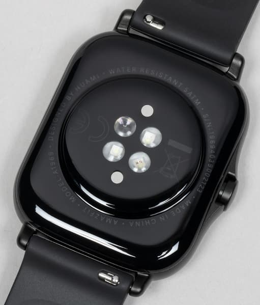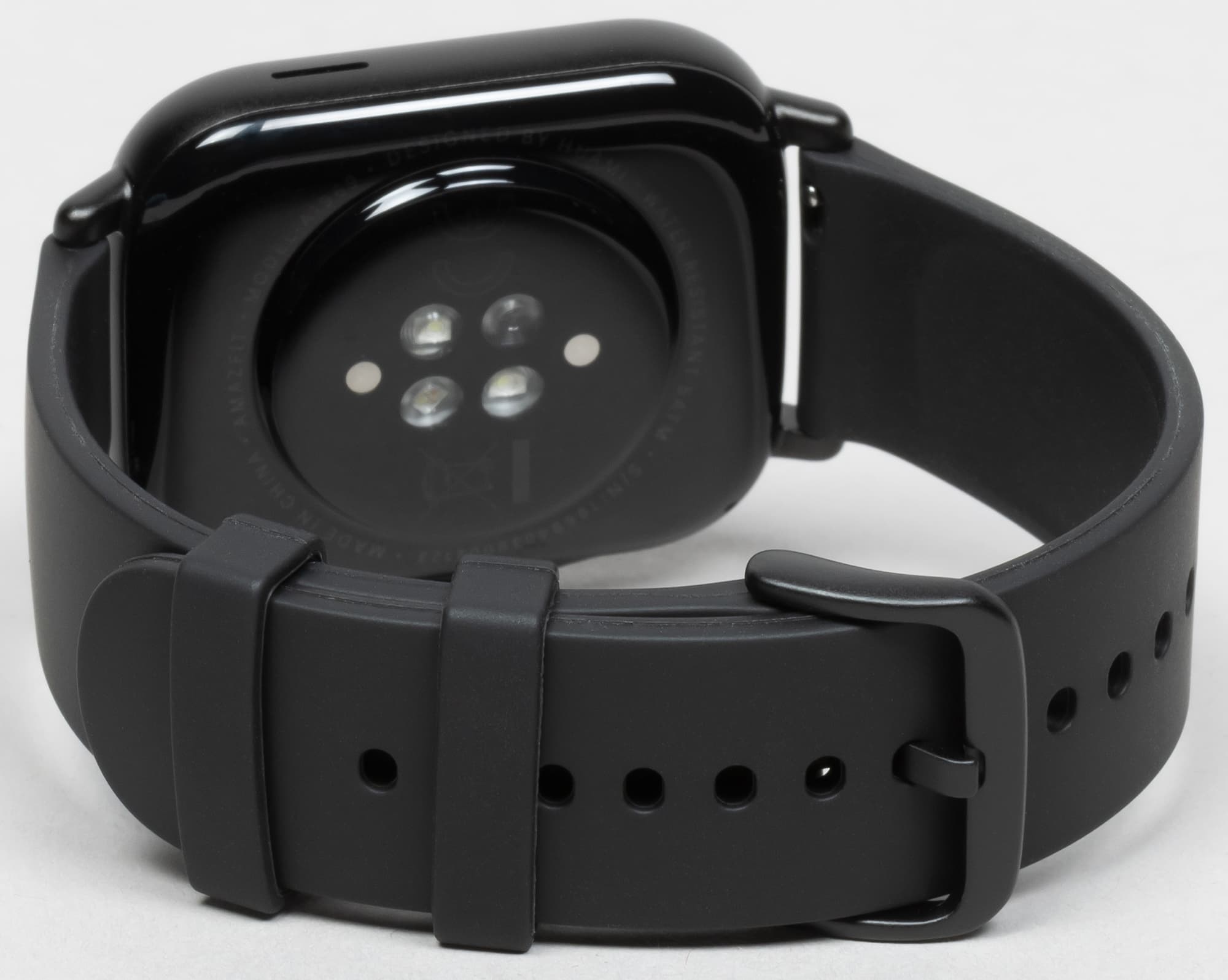 Тыльная поверхность часов — пластиковая. На выступающей круглой платформе расположены оптические датчики для измерения пульса и количества кислорода в крови, а также два контакта для подсоединения зарядного устройства.