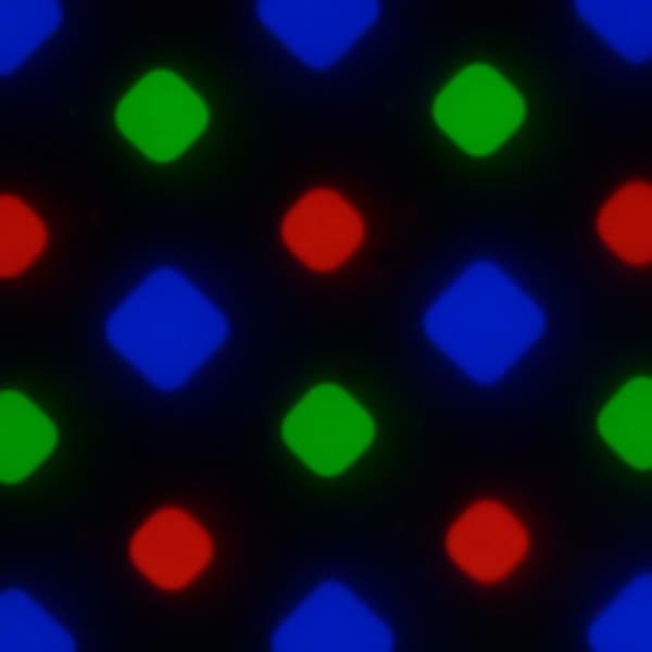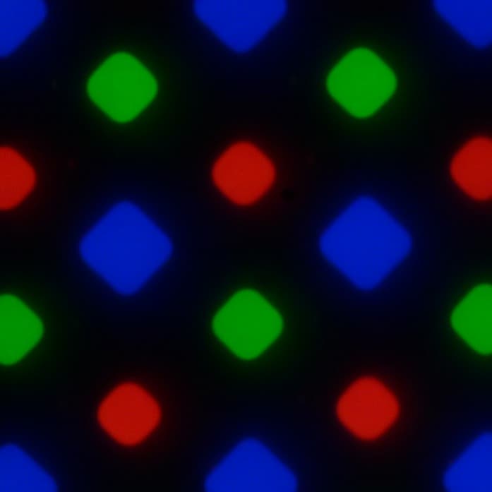 В этом экране используется OLED-матрица — активная матрица на органических светодиодах. Полноцветное изображение создается с помощью субпикселей трех цветов — красного (R), зеленого (G) и синего (B) в равном количестве, что подтверждается фрагментом микрофотографии: