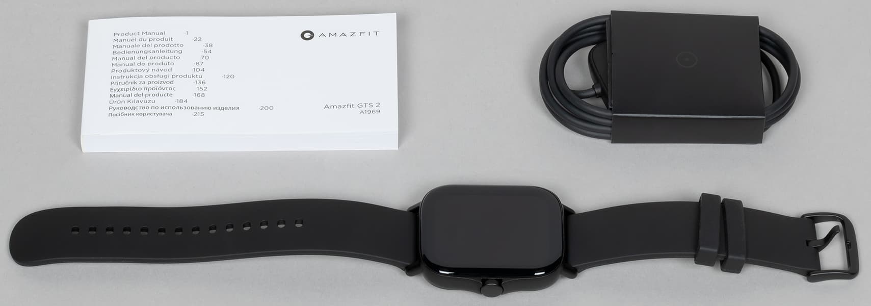 Комплектация стандартная для подобных устройств: зарядный USB-кабель, руководство пользователя на многих языках, включая русский, и сами часы.