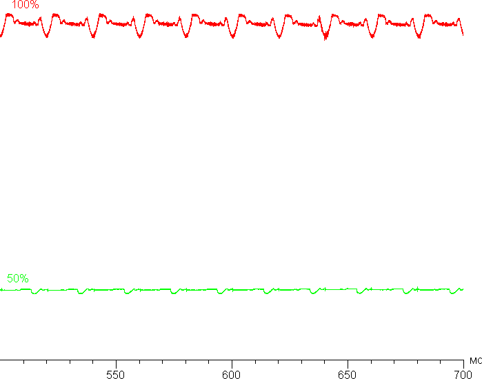 На графике зависимости яркости (вертикальная ось) от времени (горизонтальная ось) определяется модуляция с частотой 50 Гц. Однако видимое мерцание экрана отсутствует, не определяется оно и при быстром движении глаз (или, наоборот, при быстром движении часов относительно глаз).
