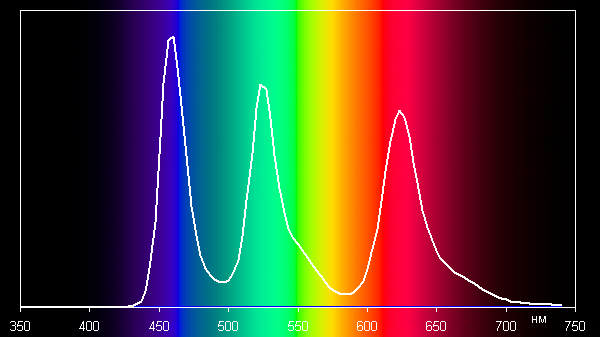 Спектр белого типичен для OLED — области первичных цветов хорошо разделены и имеют вид относительно узких пиков: