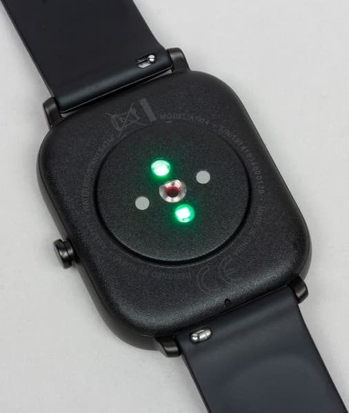 Корпус тоже алюминиевый, но, в отличие от тех же Apple Watch, удешевлен до минимума. Снизу нет стекла, площадка выполнена из пластика со своеобразным шероховатым покрытием, что, с другой стороны, делает часы Amazfit GTS почти невесомыми. Здесь можно увидеть оптические датчики и два металлических контакта pogo.