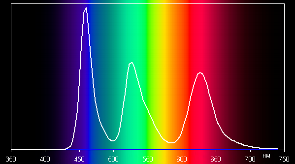 Спектры типичны для OLED — области первичных цветов хорошо разделены и имеют вид относительно узких пиков:
